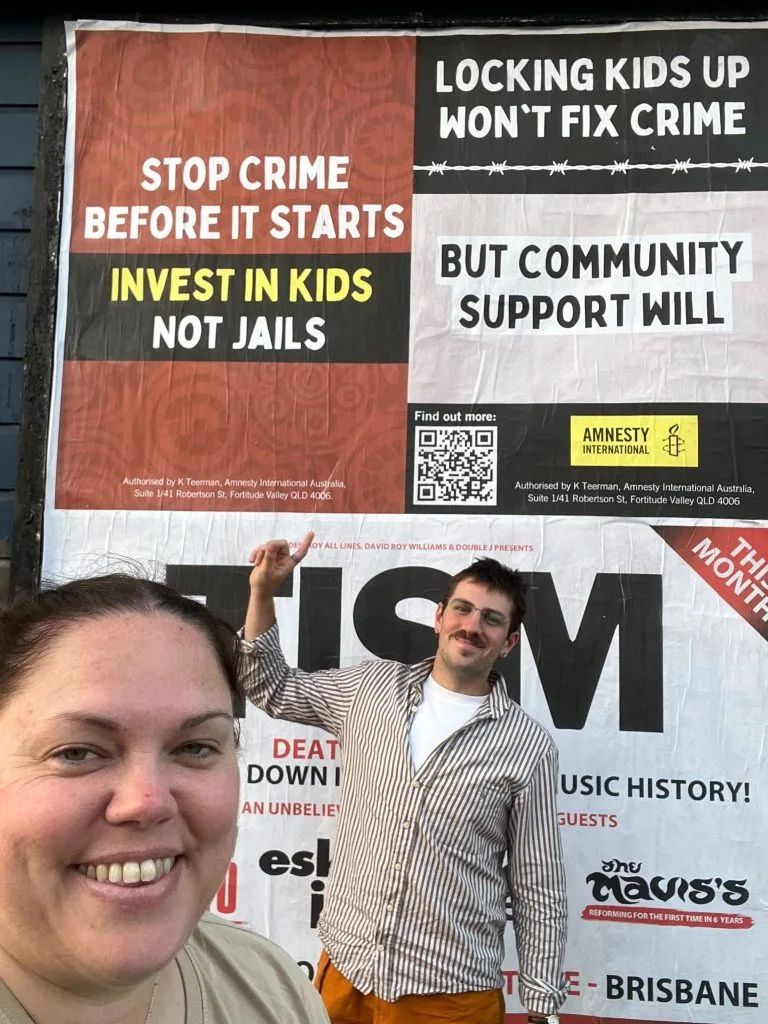 Then in the week leading up to the QLD election, we visited Yaggera, Turrbal, Yugembeh and Kombumerri Country (Brisbane, Gold Coast, Ipswich and Toowoomba), where we filmed content for our socials, met with Amnesty activists and First Nations community members, wobble-boarded in King George Square, found some of our gig posters around Meanjin, and dropped into Sobah Cafe, which is a First Nations business on Kombumerri Country in Burleigh Heads.