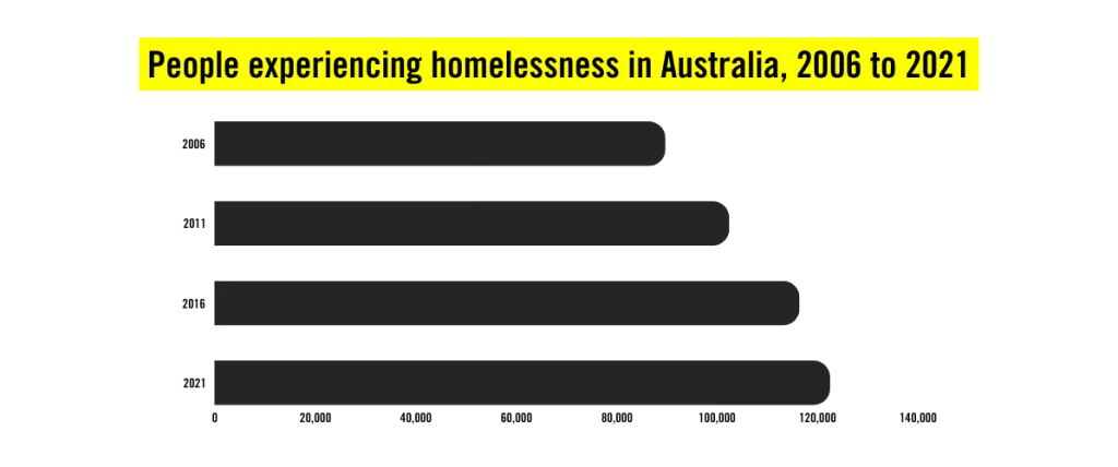 According to the Australian Bureau of Statistics (ABS), the number of people classified as homeless has been increasing steadily since 2006.