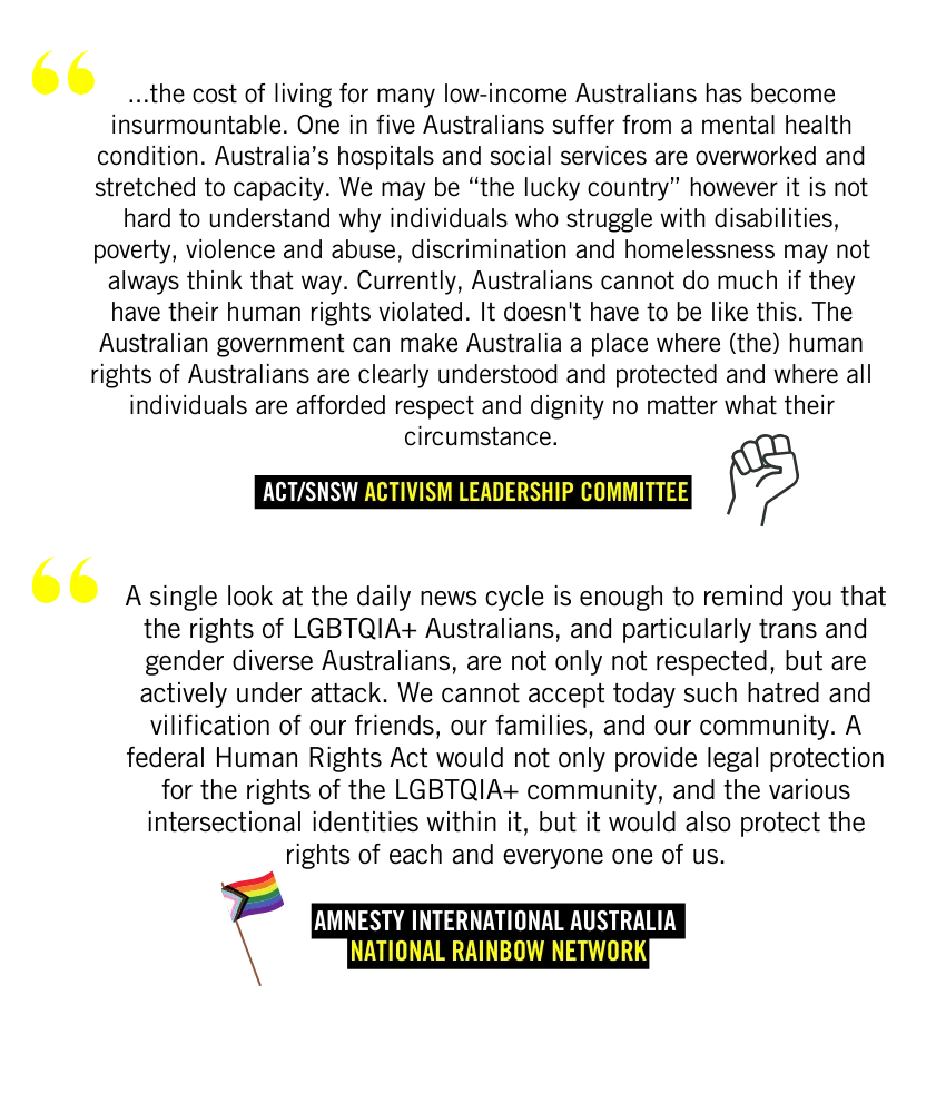 These submissions from everyday Australians, as well as the petition signed by Amnesty supporters in support of a Human Rights Act, add considerable weight to the government’s final decision. Such actions make a true impact to ensure human rights are protected across the nation. From Mudgee to Darwin, and everywhere in between, people told the government why human rights matter to them, what human rights they are concerned about, and why they need the government to legislate an Act. Here’s some of the supporters shared with the government: