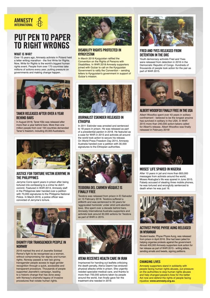 Write for Rights is the world’s biggest human rights event. Started by Amnesty International over 20 years ago, this annual campaign brings together millions of compassionate people from around the world to make a stand for freedom, justice and equality. By collectively challenging injustice, we change lives. And every time we secure justice for one individual, we move closer to a world where human rights are enjoyed by all.