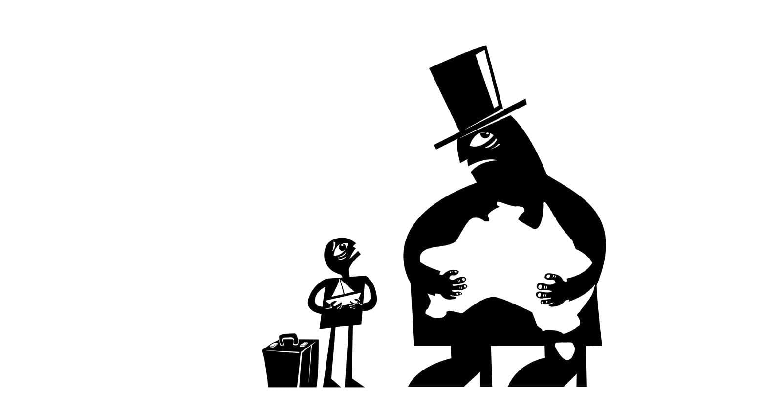 The giant man with hat and dark suit is a stereotypical Australian politician. The tyrannous gatekeeper to the ‘golden’ shores of Australia. He holds the geographical map of Australia close to his chest and he refuses to share it with the asylum seeker. The word ‘Welcome’ is stencilled above ironically
