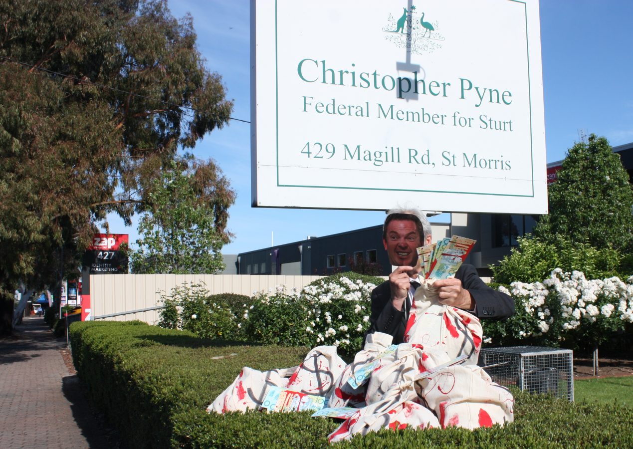 Activists from the Ministers’ federal electorate of Sturt presented the blood money petitions in large money bags covered in fake blood to a member of Minister Pyne’s team, who seemed confused at first and then slightly annoyed by the sheer number of petitions and weight of the money bags.