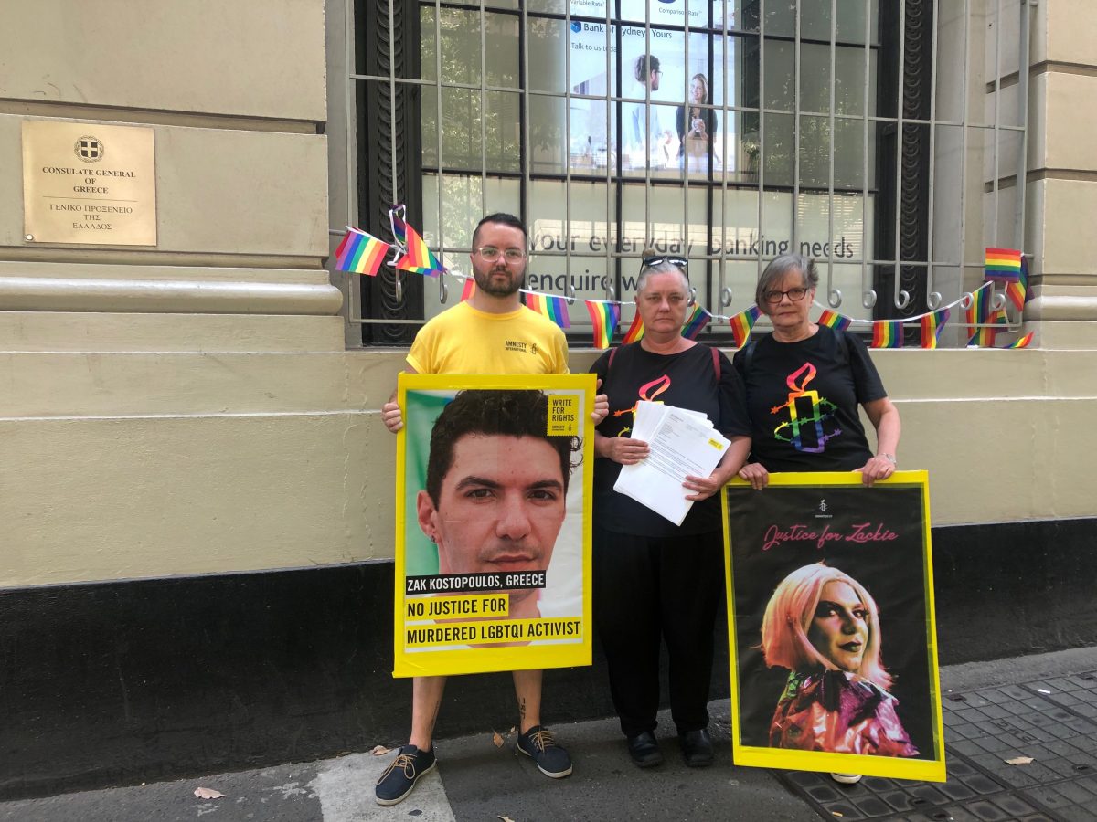Almost 10,000 signatures have been handed to the Greek Consulates in Sydney and Brisbane as part of a global Amnesty International campaign demanding justice for murdered Greek LGBT activist, Zackie.