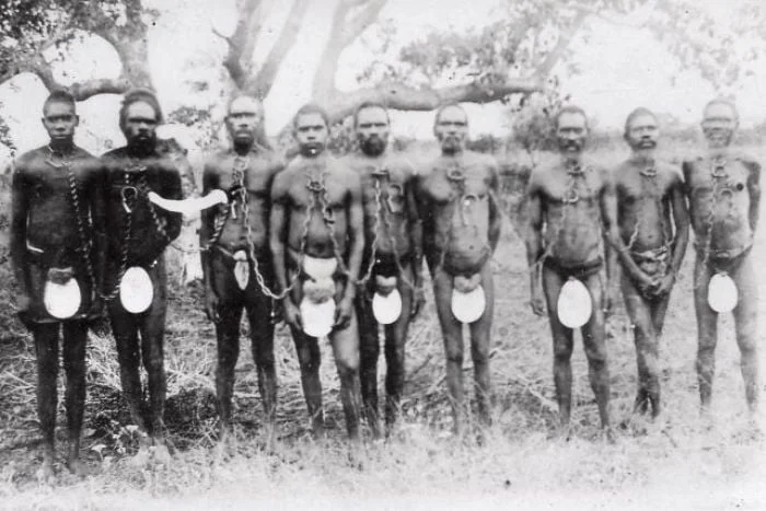 Chained Aboriginal people wearing riji (carved pearlshell) as they stand in the mangroves of Broome, c. 1910.