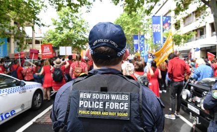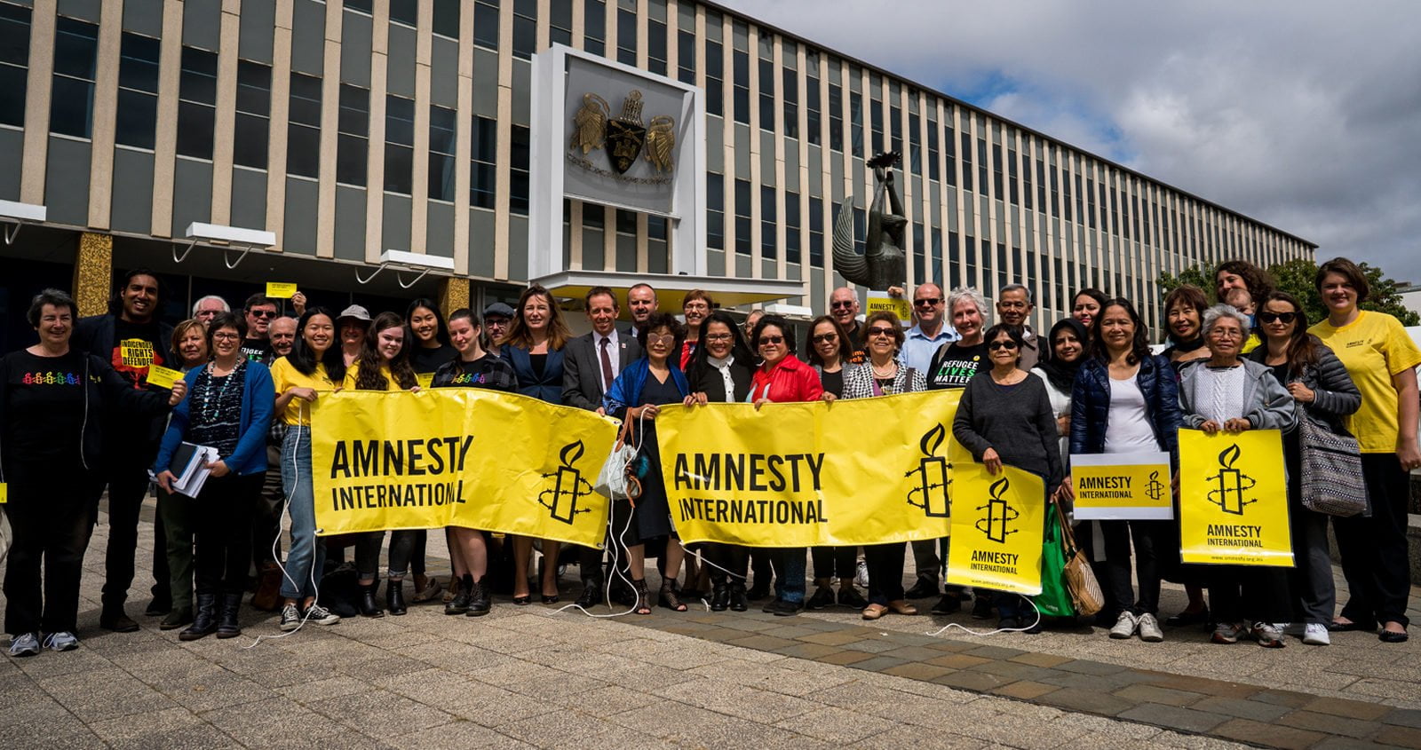 A group of people holding yellow Amnesty banners standing outside Parliament House in Canberra
