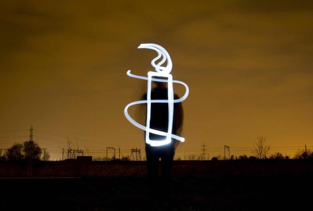 Amnesty Candle - light drawing. A light artist stands against a dark night sky and paints the AI candle.