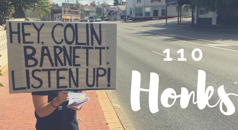 The Crisis Response Network WA in partnership with the Curtin Uni group and Indigenous rights group also orchestrated monthly honk-a-thon stunts. The event placed pressure on the WA Premier to keep youth justice particularly for Indigenous young people on his agenda.