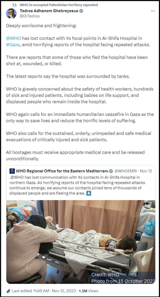 A post on ‘X’ (formerly Twitter) by the IDF claims they were “carrying out a precise and targeted operation against Hamas in a specified area in the Shifa Hospital.”