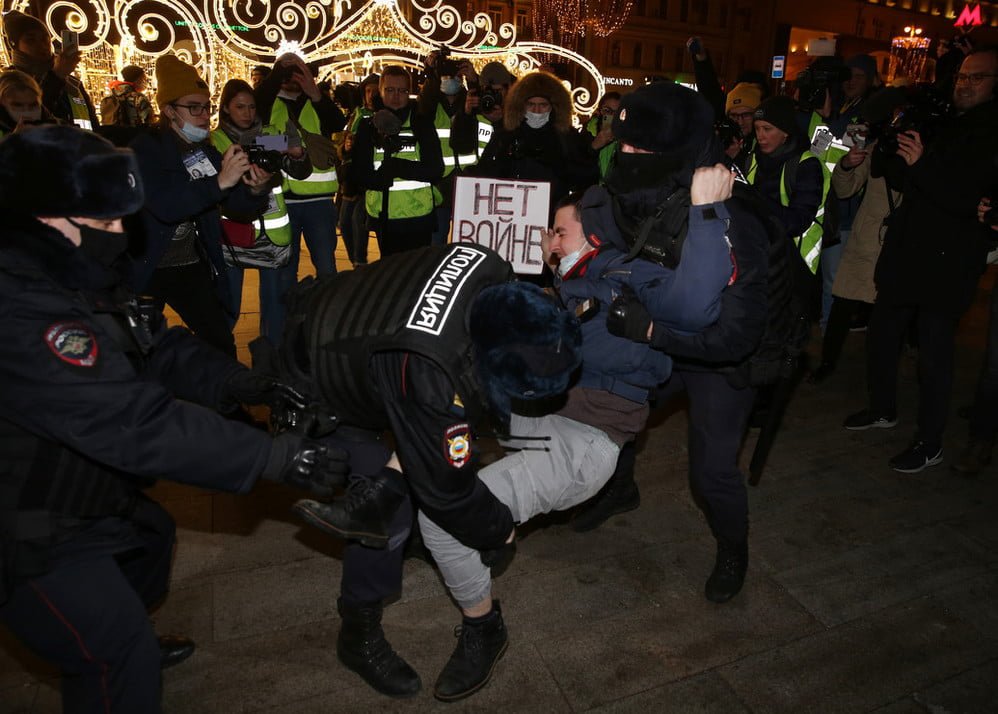 Over the first four days of invasion, Russian police routinely used force to disperse nationwide anti-war protests. According to human rights NGO OVD-Info, over 5,900 peaceful protesters have been arrested in at least 67 cities and towns across Russia. On 24 February, political philosopher Grigory Yudin was beaten unconscious by the police and briefly hospitalized.