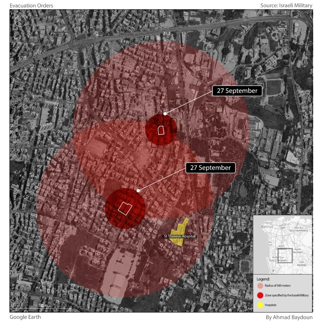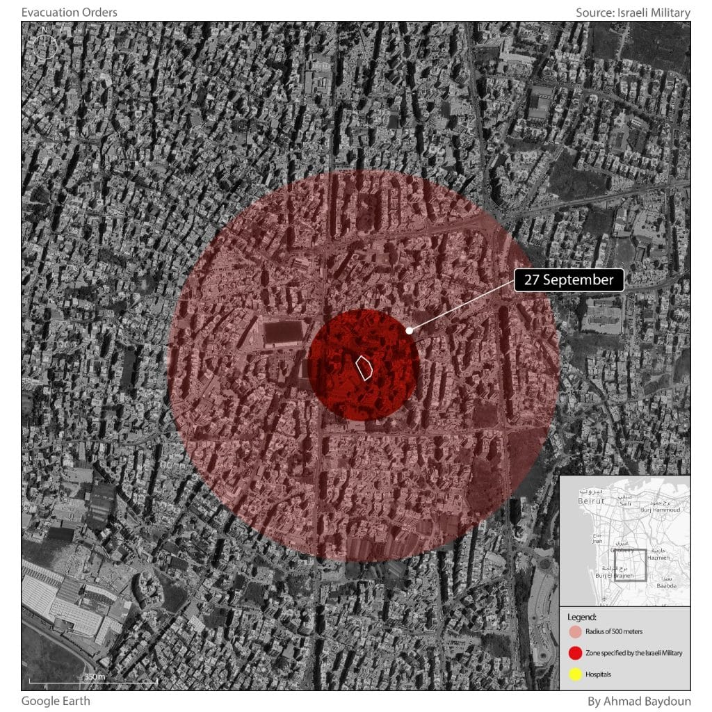 Starting at 11:06 pm on 27 September, the Israeli military began to issue evacuation warnings to residents of Dahieh. In the first warning, the Israeli military instructed residents via X (formerly Twitter) to move 500 metres away from three buildings in the neighbourhoods of al-Laylaki and al-Hadath, both of which are densely populated areas, alleging residents there are “located near Hezbollah interests”. The order did not give a timeframe for evacuation.