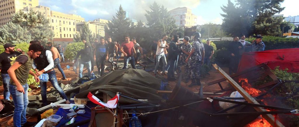 Protesters have come under attack from supporters of ruling political groups Amal and Hezbollah who chased demonstrators, beat them with sticks and set fire to their tents – © AFP via Getty Images