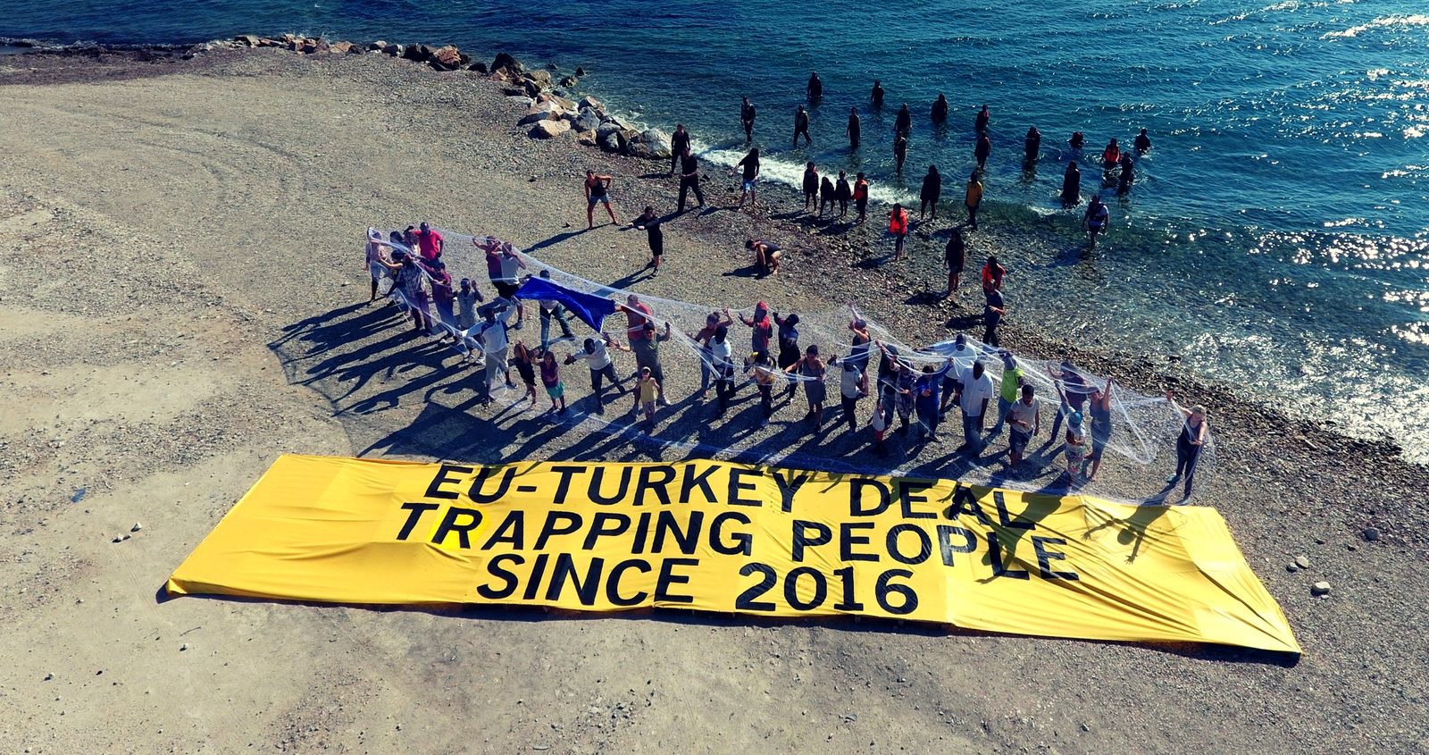 The #ActionLesvos flash mob wrapped a giant fishing net with an EU flag on it around 60 refugees and activists to represent the situation of refugees and migrants trapped on the Greek islands by the EU-Turkey deal.