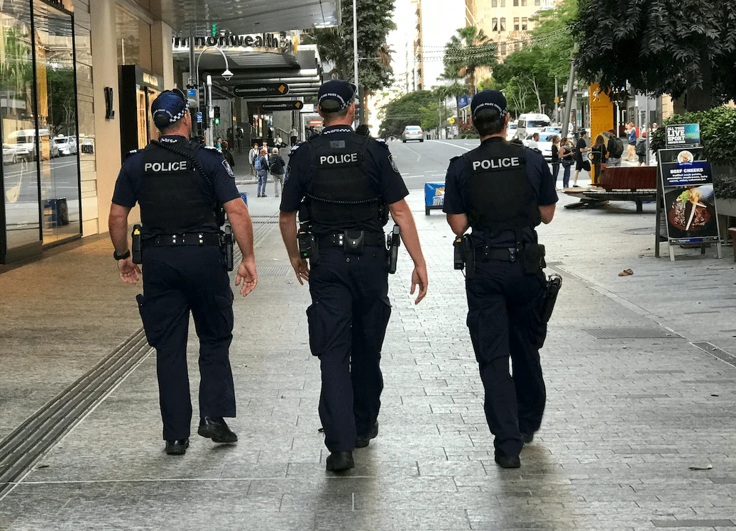 Three uniformed police officers walk the street in QLD.