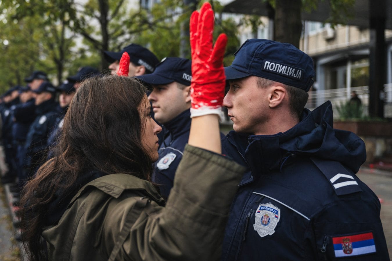 TOPSHOT - A protester faces with a Serbia's police officer showing red painted hands symbolising government neglect and mismanagement calls for the resignation of the Minister of Construction, two days after 14 people died in the collapse of part of the external roof of a station in Novi Sad, during a protest called by by student organisation