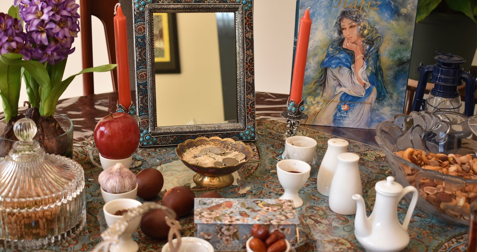 In addition to the seven core objects required for the Haft-Seen, Ladan includes extra items on the table; hard boiled eggs, dyed with red onion skins, to represent fertility. Dry rice, symbolising food. Coins for prosperity and wealth. A book of poetry by the famous Persian poet, Hafiz, is also placed on the table, alongside a mirror, candles, a prayer book, hyacinths and a goldfish. “Everyone sits around the table, waiting for the second that the New Year starts. Candles, so there will always be light and so one is enlightened. The goldfish and the hyacinths signify both life and Spring. People can look in the mirror and see their reflection and reflect on the year that passed and pray for the best for the year ahead”.