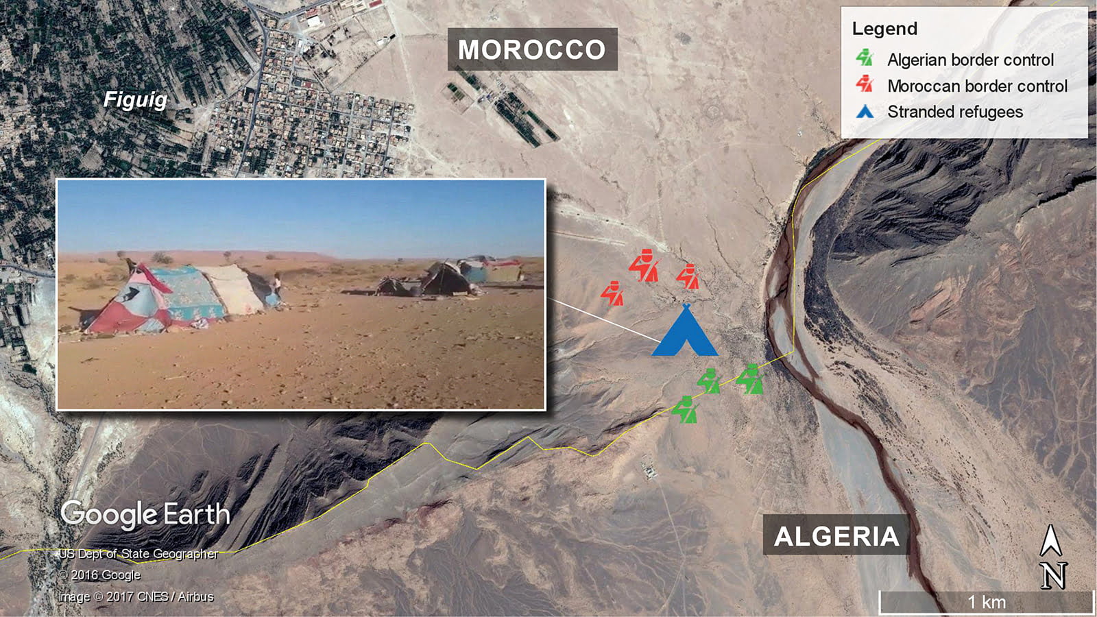 The group had initially travelled from Lebanon to Sudan then through Libya and Algeria to reach the border area. They made a first attempt to reach the closest Moroccan town Figuig on 17 April but were pushed back to the buffer zone by Moroccan security forces.