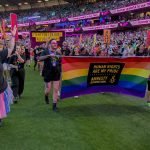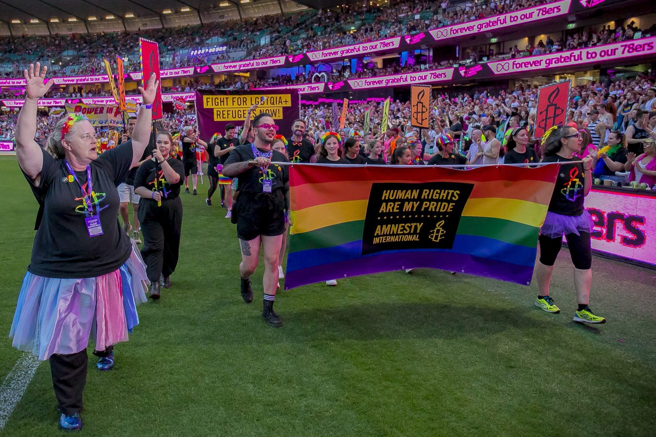 Members of the NSW LGBTQIA+ Network participating in the Mardi Gras Float at the SCG. A large banner at the front reads: "Human rights are my pride".