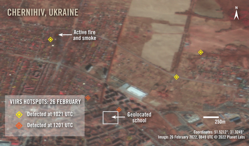 On 17 February, during increased shelling along the line of control, Russian-backed forces struck a kindergarten in the town of Stanytsia Luhanska, wounding three civilians. On the evening of 25 February, a missile damaged School No. 48 in Mariupol, blowing in windows and pockmarking the walls with metal fragments. And, on 26 February, an explosive weapon, most likely an artillery shell, hit the second story of a kindergarten in Chernihiv, starting a fire that was likely detected by VIIRS environmental satellite sensors.